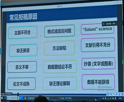 论文发表,质量是关键。孔风老师从论文的标题、摘要、引言、方法与结果、讨论五个部分对“好文章”进行了详细介绍,特别强调摘要与引言的规范性和新颖性问题,因为二者直接决定了审稿人是否有兴趣把论文读下去。孔风老师分别从列举反例、需要注意的问题、具体方法指导等方面进行阐述,为在座的师生明辨了论文修改方向。同时,孔风老师指出了反复修改的重要性,“文章不厌百回读,反复推敲佳文来”的格言令人深以为然。