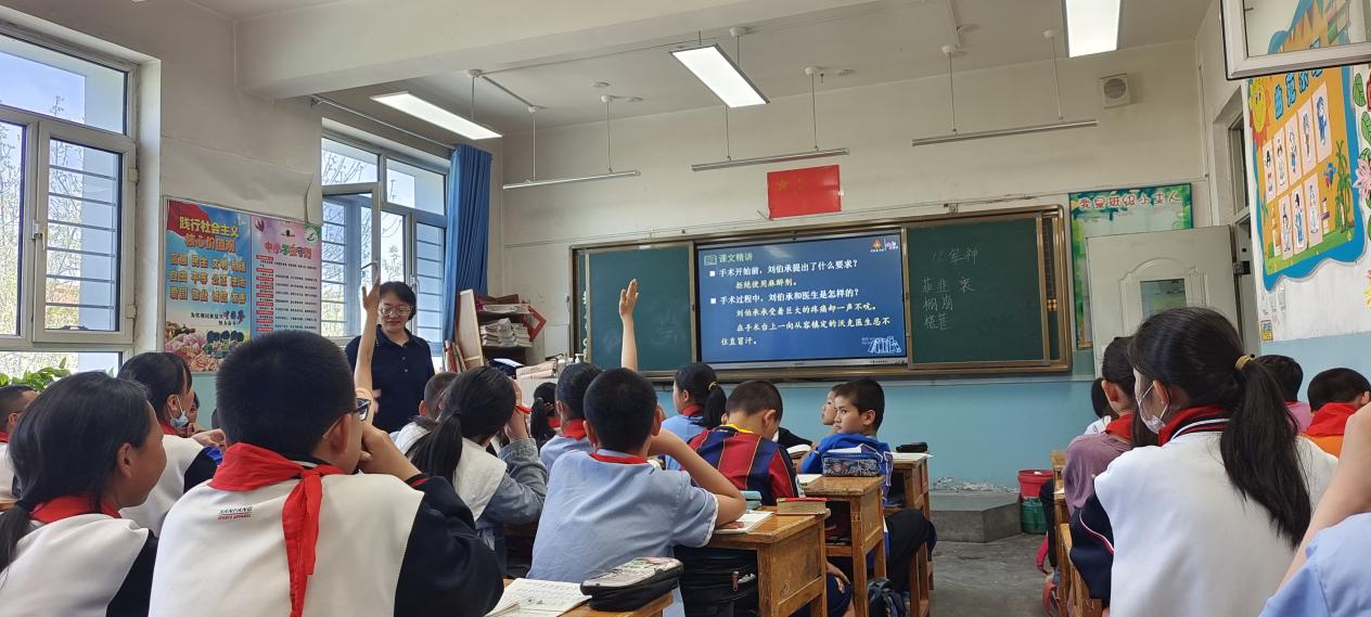 进入校园后,同学们有条不紊地分组前往各班,参与小学教师的日常工作,踏入课堂。五年级 1 班正在讲授语文课文《军神》,课堂氛围十分活跃,师生之间互动频繁。老师循循善诱,极大地帮助了学生深入体会课文中主人公的思想情感变化;学生积极回答问题,进一步掌握了文章的主旨大义。通过课堂上的师生互动,极大地提高了课堂的有效性。学生能够了解自己目前的学习状态,看到自己的进步以及存在的不足,还能够得到教师提出的建议,有助于调动学生的积极性,提高学生学习兴趣,促进学生的发展。