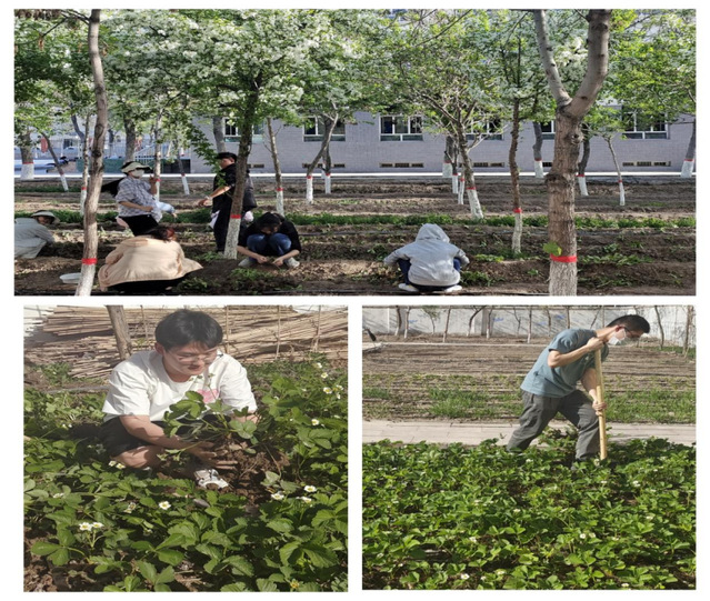 接下来,同学们来到幸福石榴园劳动实践基地。七个小组各自领取了相应的劳动任务,随后按照分工安排前往地里开展劳动。铺膜小组由两个男孩子负责拉薄膜,女孩子则用铁锨在薄膜边缘进行盖土操作。在小组成员的默契协调配合下,一块块土地被薄膜完整且严实的覆盖。而种植草莓的小组也在辛勤劳作且相互配合,一部分小组成员在原来的草莓圃中挖掘草莓植株,另一部分则在新的种植园里进行移栽。没多久,草莓植株便被迅速且及时地移栽到了新的苗圃里。