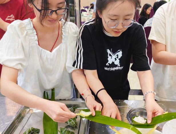 活动伊始,主持人梁宇芯和冯丽娜同学为大家讲解了端午节的由来以及各地不同的节日习俗。他们重点介绍端午节挂艾草、佩香囊、吃粽子等传统习俗,并通过视频向同学们教授包粽子的方法。随后,同学们在老师的指导下,互相交流包粽子的技巧,尽情享受着亲手挽粽叶、塞粽馅的喜悦,切身感受了端午节浓浓的节日气氛,大家都纷纷表示今年的粽子定然“分外”香甜。一片片清香粽叶,一粒粒晶莹糯米,在一双双巧手下转眼变成玲珑可爱、各具特色的诱人粽子。