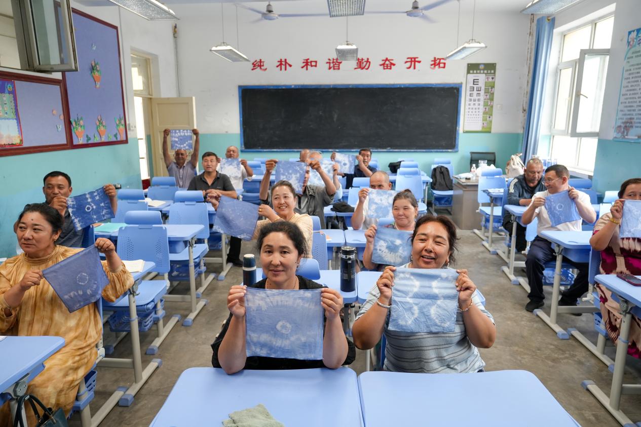在扎染工作坊里,老师们围坐在一起,跟随实践团成员的指引,有条不紊地将白布浸湿、折叠、捆扎、浸染。不一会儿,一幅幅蓝白相间、花纹独特的扎染作品便新鲜出炉。一位老师兴奋地展示着自己的作品,激动地说:“没想到白布经过这几个步骤能呈现出这么好看的图样,中华优秀传统文化太神奇了!未来我也要把这样的趣味课堂带到我的教学中,让学生们也能感受到中华优秀传统文化的博大精深。”