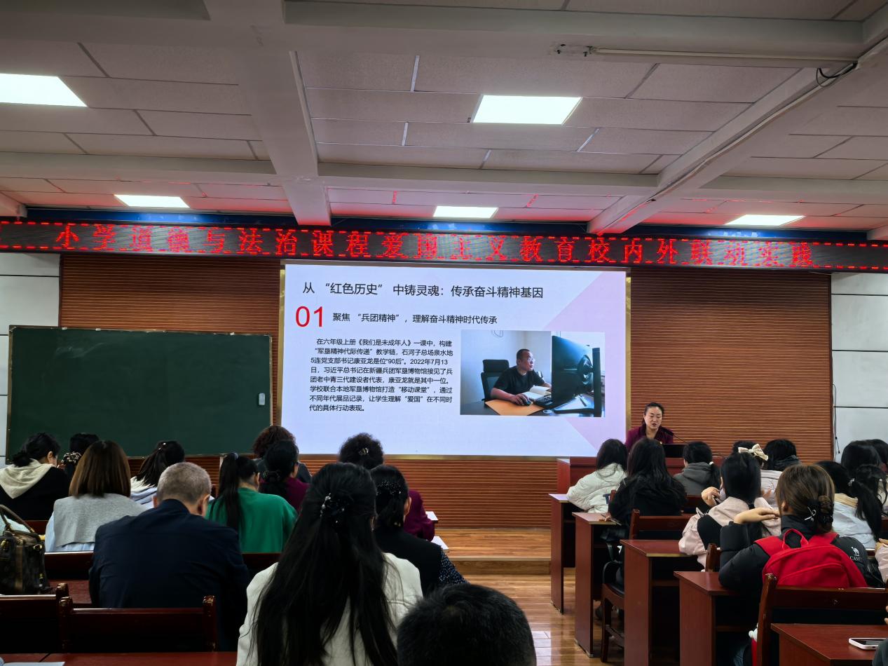 首先,师范学院师生共同参与了石河子第十一小学举办的“小学道德与法治课程校内外联动会议”。会议伊始,石河子第十一小学张艳校长以“如何上好道法课:从国家符号出发,将抽象概念具体化”为主题进行了专题讲座。她强调,优质的道法课应善于挖掘身边的鲜活素材,充分依托石河子本地的红色教育资源,紧密联系学生的生活实际,将抽象的理论知识与价值观念转化为可知可感的生动体验,真正让德育内化于心、外化于行。
